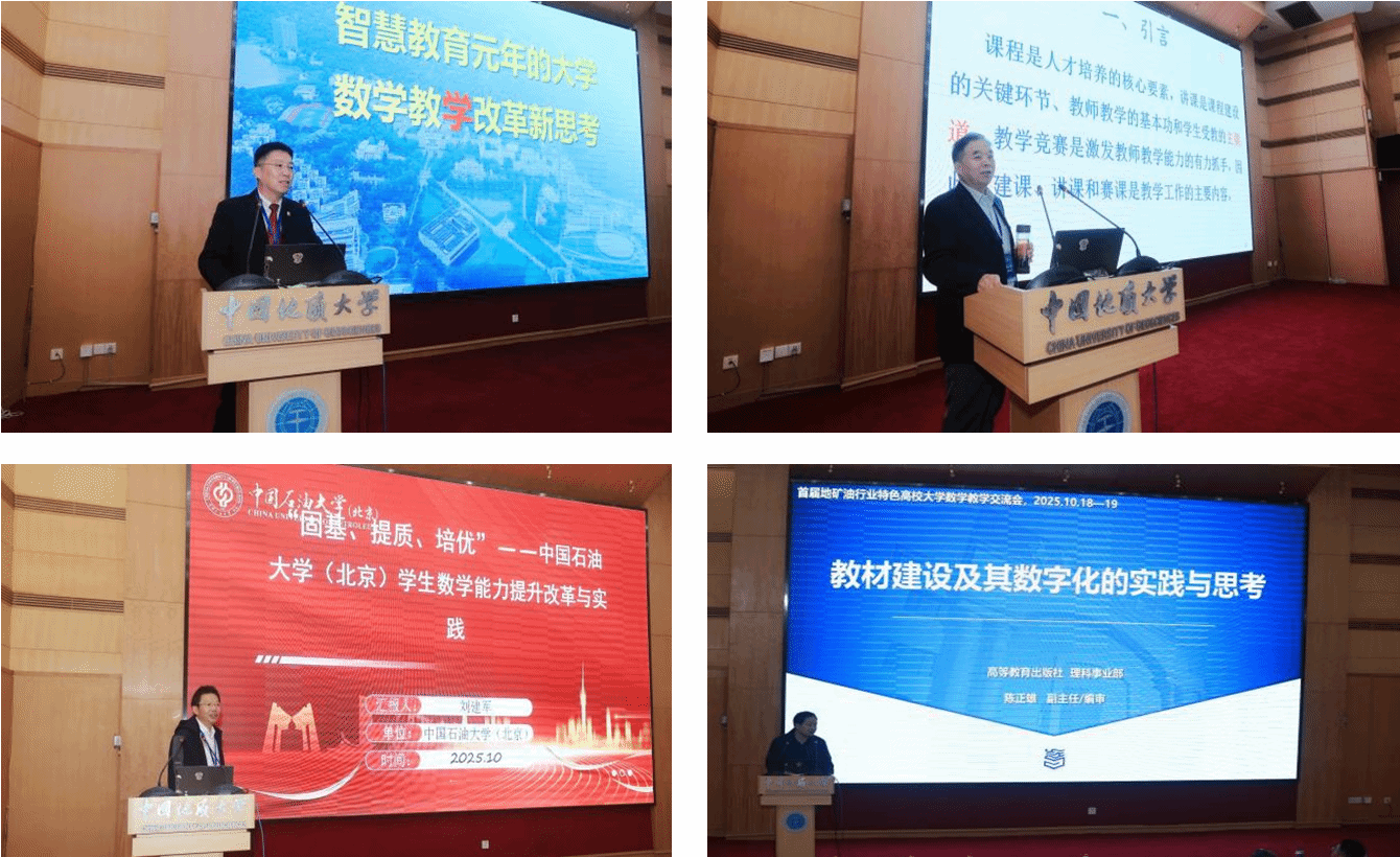为期两天的会议采用“主旨报告+分会场报告+课程分组研讨”相结合的形式进行。在主旨报告环节,汕头大学校长郝志峰以“智慧教育元年的大学数学教学改革新思考”为题,结合汕头大学的实践探索,提出了具有启发性的教学改革路径,引发与会者的积极讨论。西安电子科技大学刘三阳教授以“关于建课、讲课和赛课的管见”为题,结合青年教师教学竞赛与教学创新大赛经验,为高校教师参与教学竞赛提供了实用指导。中国石油大学(北京)刘建军教授聚焦“固基、提质、培优—学生数学能力提升的改革与实践”,分享该校如何借助大数据分析优化教学设计,并介绍了相关成功经验。高等教育出版社理科事业部副主任陈正雄则从教材建设角度出发,展示了高教社在数学教材数字化与案例资源建设方面的最新成果,鼓励高校教师积极参与教材创新与实践应用。在分会场报告中,来自地矿油及其他相关高校的专家学者围绕大学数学教育、公共课教学改革、拔尖人才培养等议题展开充分交流与分享。