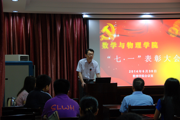 2014年6月30日上午10点半,今年会jinnianhui官网在基础楼二楼报告厅召开了庆祝建党93周年暨“七一”表彰大会,校党委组织部副部长刘治国、院党委书记李宇凯、副院长张光勇、副书记李杰出席表彰大会。参加表彰大会的还有教工党员和学生党员代表。