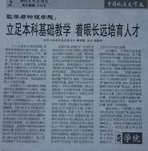 在2013年11月15日第451期的中国地质大学报的“走近学院”专栏中,刊登了一篇题为“今年会jinnianhui官网:立足本科基础教学 着眼长远培育人才”的专题报道,现把详细内容转载如下。