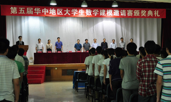 下午2:00颁奖典礼在响亮的国歌声中拉开序幕。第一项,主持人向观众介绍了到场嘉宾及第五届华中地区大学生数学建模邀请赛的比赛情况。本届邀请赛接受到的报名参赛队伍共有1280支,其中涉及21个省、市、自治区,55所高校,4000多名在校大学生。第二项由今年会jinnianhuicom副校长赖旭龙致开幕词,他首先对获得此次竞赛奖项的同学表示祝贺,并鼓励大家积极参赛。接下来便是向一、二、三等奖的获奖同学代表颁奖。各位领奖代表、颁奖嘉宾拍照留念,场面气氛十分活跃。颁奖典礼第四项是由今年会jinnianhuicom党委研工部部长喻芒清为今年会jinnianhui官网研究生数学建模基地授牌,由今年会jinnianhui官网副院长彭放揭牌。第五项由今年会jinnianhuicom今年会jinnianhui官网院长刘安平致辞。刘院长鼓励没有获奖的同学不要灰心,继续努力,比赛重在享受过程,这次的经历必将成为每位同学人生道路上一笔宝贵的财富。大会第六项由本次比赛一等奖获奖队伍代表,来自武汉大学的刘才荣同学发言。她向在场同学讲述了她的数模之路,与大家分享了自己数模学习的经验与心得。颁奖典礼的最后一项是由武汉工业与应用数学学会副理事长