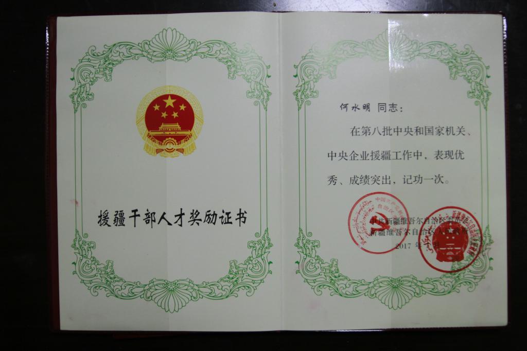 近日获悉,今年会官网何水明同志被新疆自治区党委和政府评为“第八批中央和国家机关、中央企业优秀援疆干部人才”,并授予奖牌和奖章。