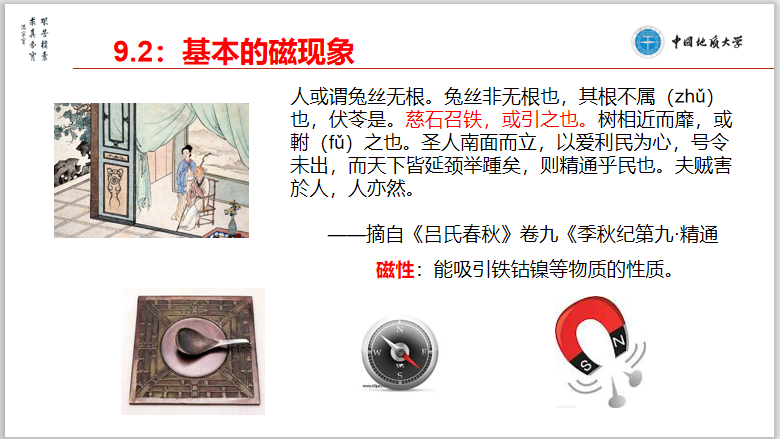 结合线上教学对时空限制的弱化,在编排教学内容时,大学物理云教学团队结合教学内容实际和疫情期间所涌现出的可歌可泣的英雄事迹为载体对学生进行德育教育,培养同学们在艰难的时期保持一种昂扬的斗志和“越艰险越向前”的无畏精神和勇气,敢于求真、求善和求美,如图1。例如,在讲到牛顿运动定律和狭义相对论时,结合当时牛顿和爱因斯坦分别所处的环境,培养同学们在抗击疫情期间,不畏艰险,不忘对知识的渴望,对真理的孜孜追求以及敢于质疑和挑战的勇气;在讲到守恒律与对称性时,教导和培养学生“美美与共,天下大同,既要各美其美,也要美人之美”的欣赏和发现美的品质;在讲到铁磁现象时,引用我国优秀传统文化《吕氏春秋》中对磁现象的阐述(如图2),同时结合疫情期间中国神州大地所充满的“人间大爱”为载体,培养同学们“利民爱民”之品质,培养同学们“小爱之心存善念,乐于奉献;大爱之勇于担当的家国情怀。”
