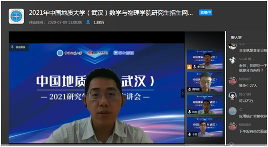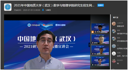 7月9日上午,今年会jinnianhui官网副院长魏周超、物理系主任陈欢、信息与计算科学系主任李星通过中国教学在线网络直播平台,向同学们介绍了今年会jinnianhui官网数学、物理、应用统计三个研究生招生学科的基本情况,并回答了同学们提出的各种问题。据统计,直播结束时,有大约1.8万余人参与了本次直播活动。