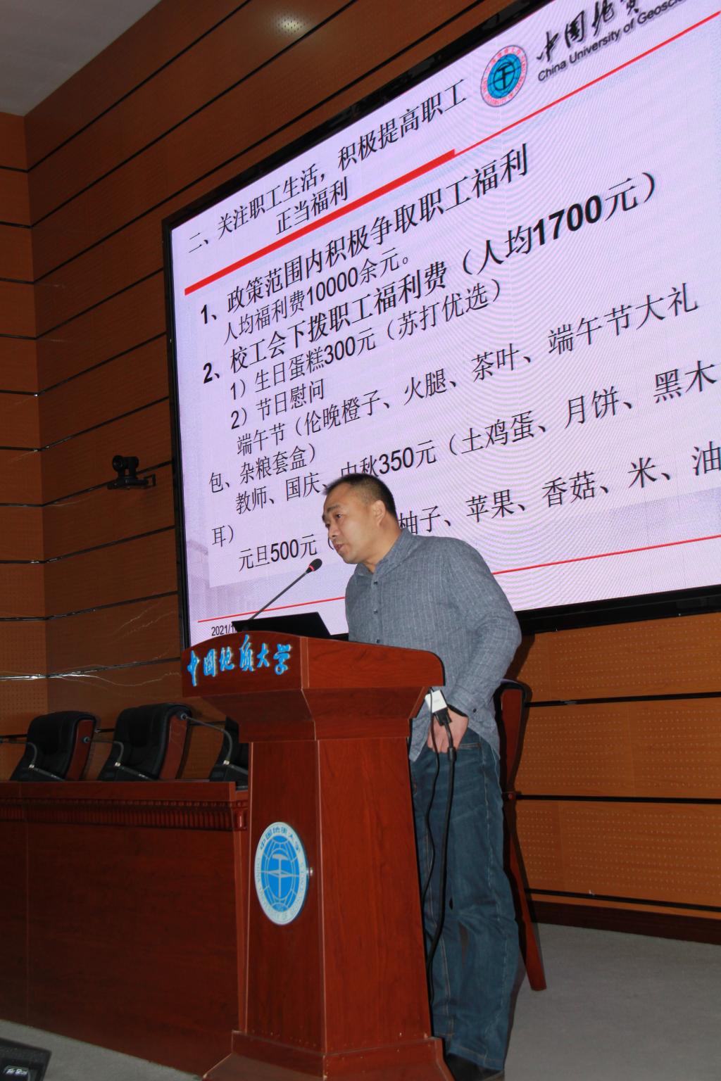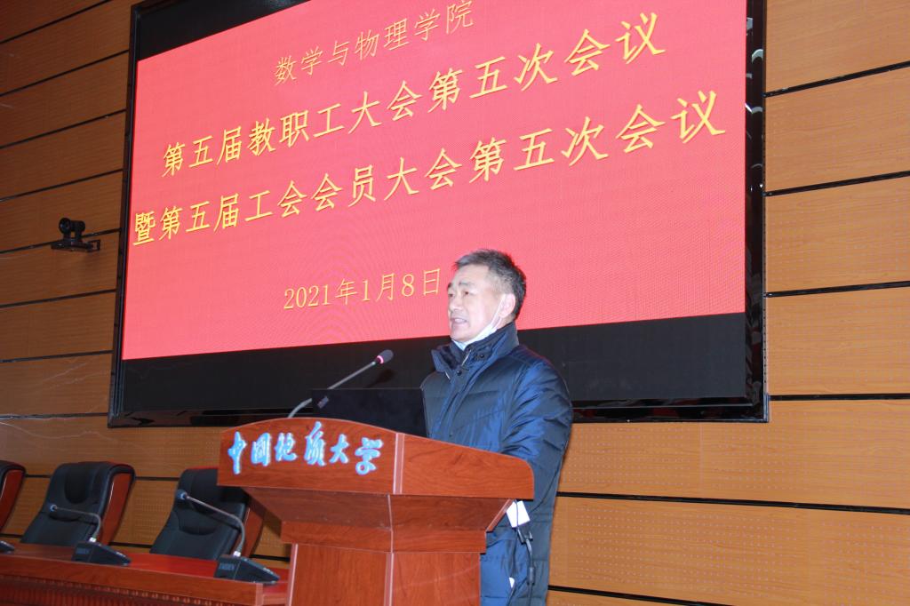学院分工会主席王希成代表工会委员会做了工会年度工作报告及经费使用说明。他在报告中回顾了2020年工会工作以及学院工会在学校各项比赛中取得的成绩,号召全院教职工和工会会员要认真学习贯彻党的十九大、十九届五中精神,以习近平新时代中国特色社会主义思想为指导,在总结“十三五”成果的基础上,谋划好学院“十四五”规划,充分发挥主人翁精神,弘扬“严在地大”优良传统,抓住机遇,迎难而上,为完善学院治理体系,提高学院治理能力,促进学院各项事业迈上新水平、出现新局面而努力奋斗。