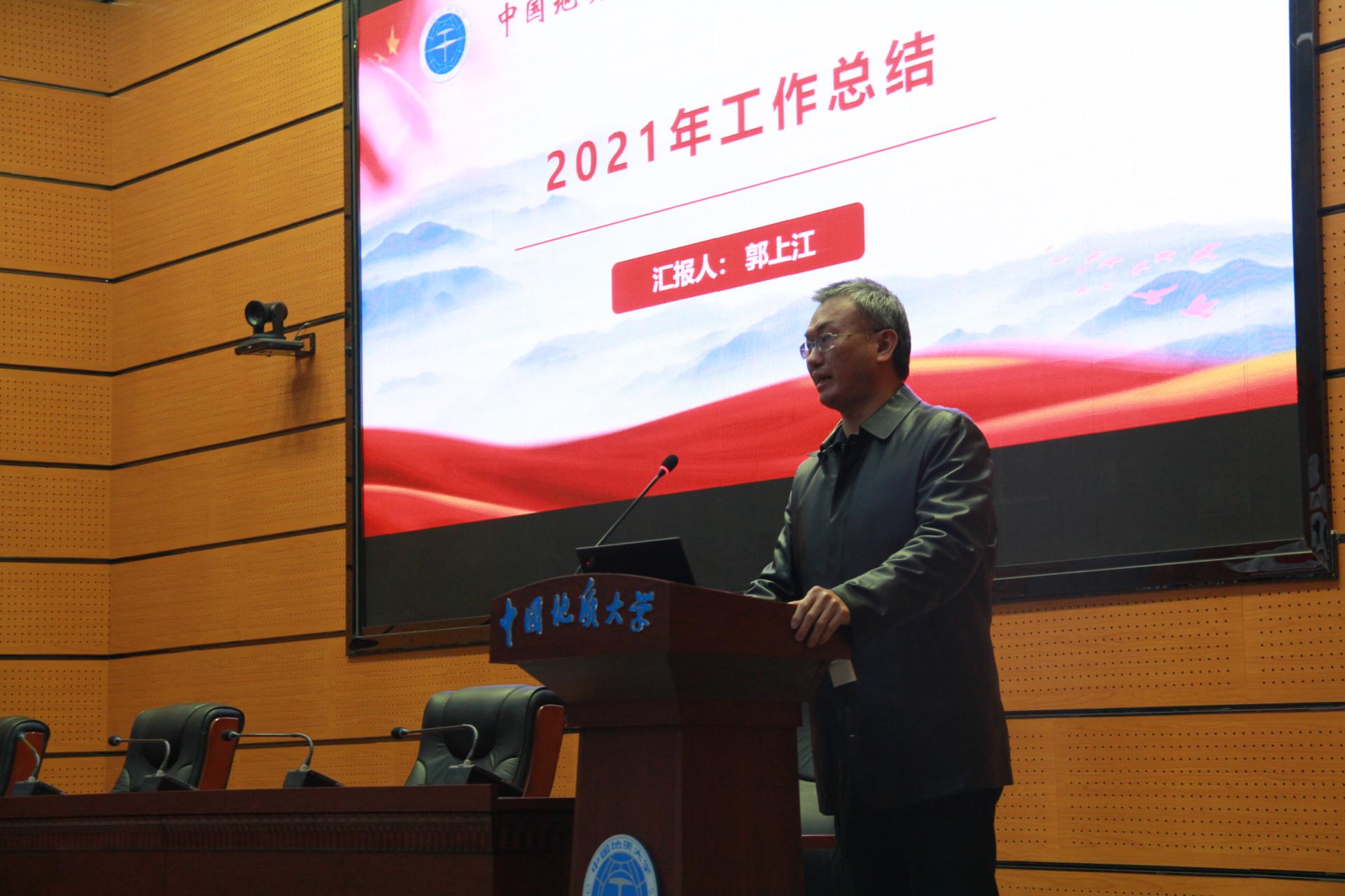 院长郭上江代表学院领导班子作了2021年工作报告。他在报告中全面总结了学院一年来的各项工作,重点介绍了在党建与思想政治工作、学科与人才队伍建设、本科教学工作、科研工作与国际交流、学位与研究生教育工作、实践教学与安全工作、学生工作、少数民族预科生教育管理工作等方面取得的突出成绩,2021年学院取得了以科研成果亮点突显、研究生教育步入新阶段等为代表的10项标志性成绩。同时分析了学院存在的问题及原因,对2022年工作进行了展望,着重强调了科技奖项申报、省部级平台申报等工作,争取为下一轮博士点申报工作奠定基础。