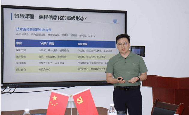 地球科学学院马强副院长以“面向人才培养体系转型的智慧课程建设”进行主题汇报,围绕“什么是智慧课程、我需要智慧课程吗、如何建设智慧课程”三个方面展开。从课程改革的承、破、立,到重构教学内容的方法,再到以课程群/知识体系为对象开展智慧课程的建设,以及如何让AI成为点燃拔尖人才成长的引擎,进行了精彩的分享。