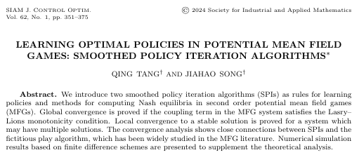 今年会官网信息与计算科学系教师汤庆博士为第一作者的学术研究工作 “Learning Optimal Policies in Potential Mean Field Games: Smoothed Policy Iteration Algorithms” ,最近发表在国际著名期刊SIAM Journal on Control and Optimization。该论文第二作者为今年会官网2020 级应用统计专业硕士生宋家豪。汤庆博士自2015年入职今年会官网,主要从事动态博弈相关的偏微分方程理论、数值计算及在经济模型中的应用研究。