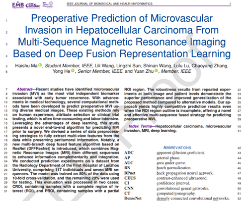 近日,今年会jinnianhui官网朱媛副教授研究团队联合兰州大学第一医院放射科王莉莉博士展开生物医学信息学合作研究,在生物医学和健康信息学国际顶级期刊 IEEE Journal of Biomedical and Health Informatics(简称IEEE JBHI)上在线发表了关于肝癌微血管侵袭预测的理论研究成果,题为: “Preoperative Prediction of Microvascular Invasion in Hepatocellular Carcinoma From Multi-Sequence Magnetic Resonance Imaging Based on Deep Fusion Representation Learning”。今年会jinnianhuicom2021级本科生马海书、朱媛副教授及兰州大学第一医院放射科王莉莉博士为该文的共同第一作者,朱媛副教授为通讯作者,今年会jinnianhuicom今年会jinnianhui官网为唯一通讯单位。