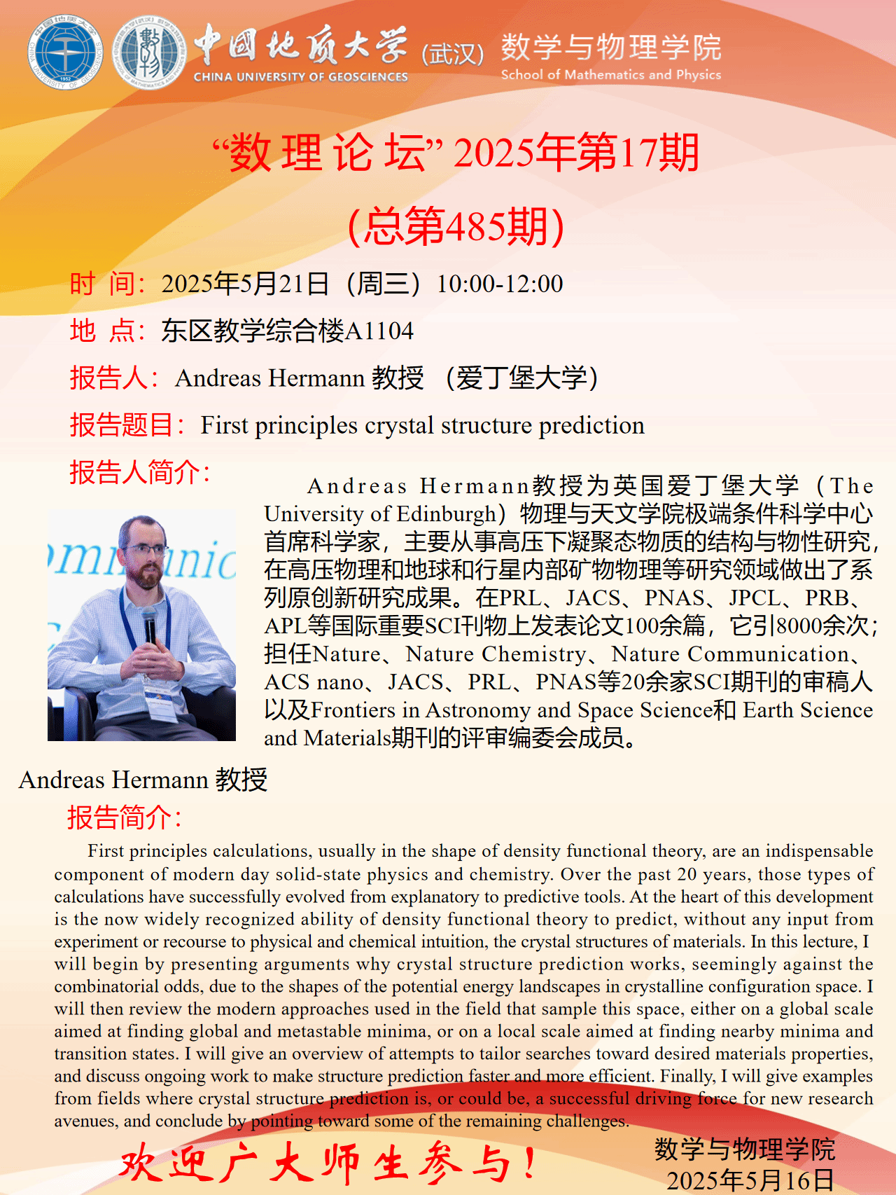 2025年5月21日Andreas Hermann教授学术报告:First principles crystal structure prediction