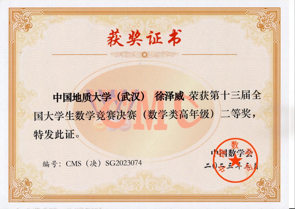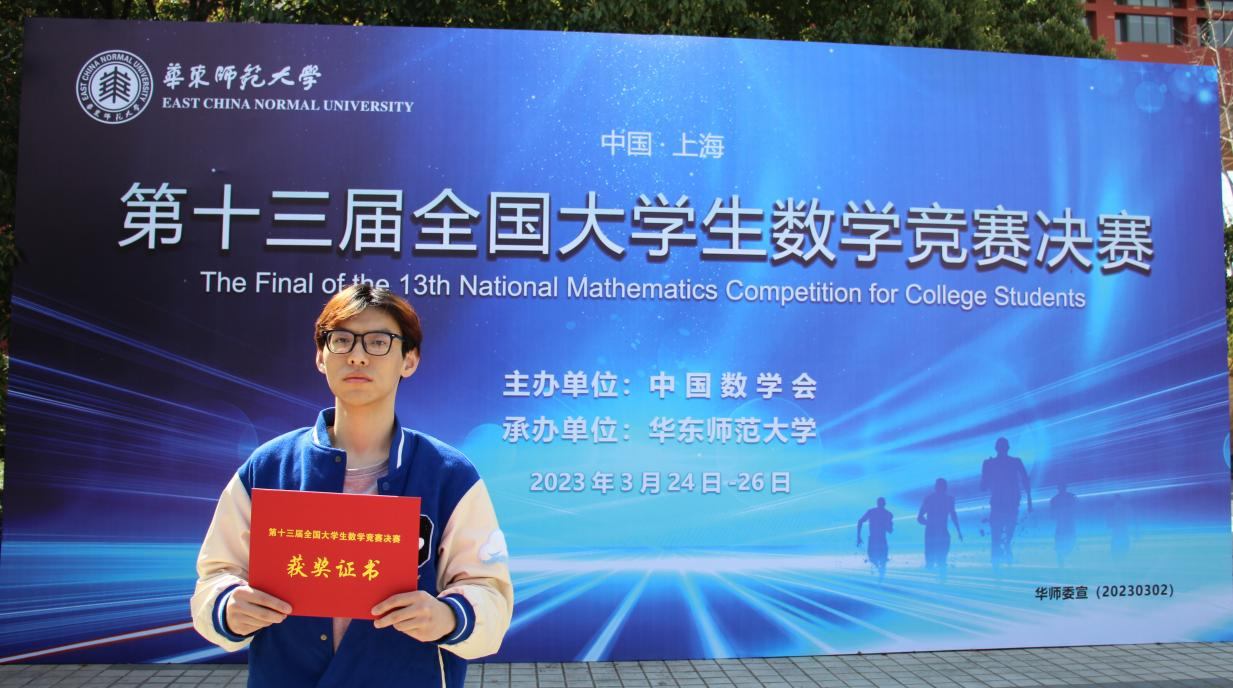 3月24日—26日,由中国数学会主办,华东师范大学承办的第十三届全国大学生数学竞赛决赛举行,今年会官网徐泽威同学获得数学专业组(高年级)二等奖。