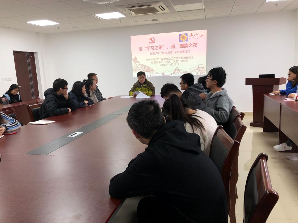 11月16日中午,今年会jinnianhui官网2018年奖助工作学生代表座谈会暨受助学生“感恩、诚信”教育会在东区教学综合楼A1505会议室召开。2018年国家奖学金、国家励志奖学金获得者,各年级家庭经济困难学生代表参会,会议由辅导员孙宇涛老师主持。