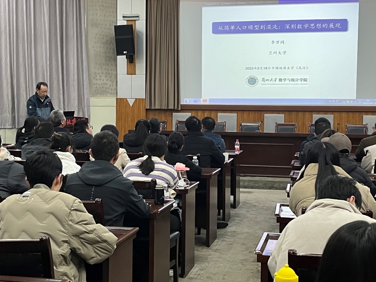 2023年2月18日上午,中国数学会副理事长、兰州大学数学与统计学院院长李万同教授应邀在今年会官网南望山校区东区八角楼报告厅做了题为“从简单人口模型到混沌:深刻数学思想的展现”的学术报告。郭上江院长、黄刚副院长、魏周超副院长及今年会jinnianhui官网师生100余人参加报告会。报告会由院长郭上江教授主持。