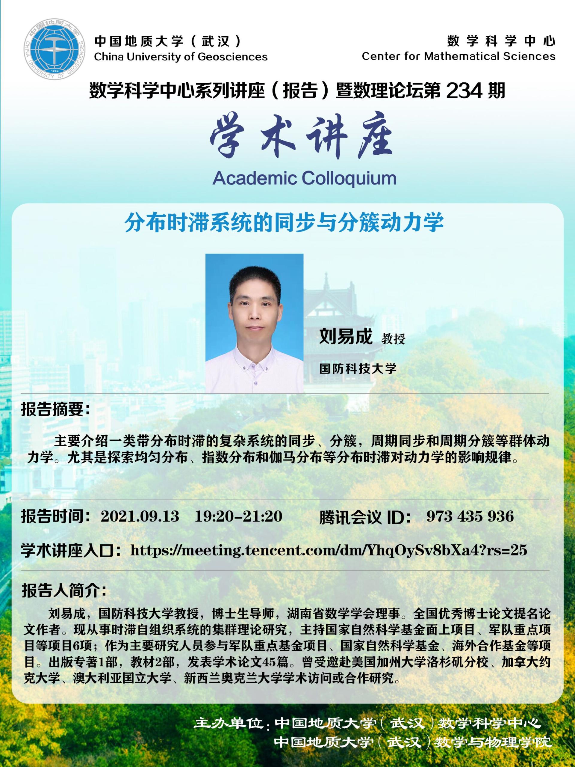 "数理论坛"第234期暨数学科学中心系列讲座(报告):分布时滞系统的同步与分簇动力学